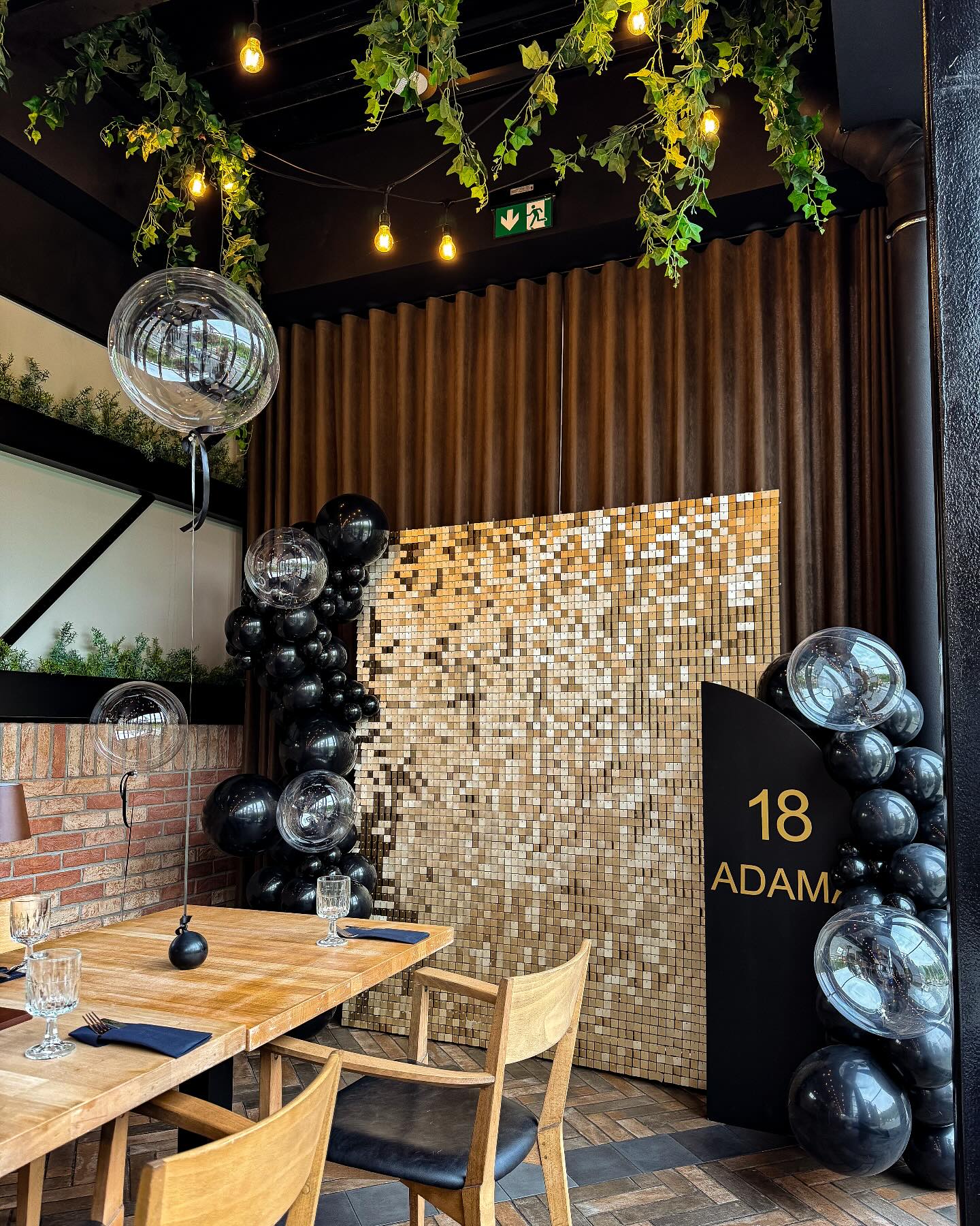 Dekoracja na 18. urodziny Adama w restauracji Strefa Smaków Kłos w Zabrzu. Cekinowa ścianka w złotym odcieniu, czarna dostawka z imieniem i liczbą 18, girlandy balonowe z lustrzanymi akcentami. Elegancka, bezpieczna i dopasowana do klimatycznego wnętrza.