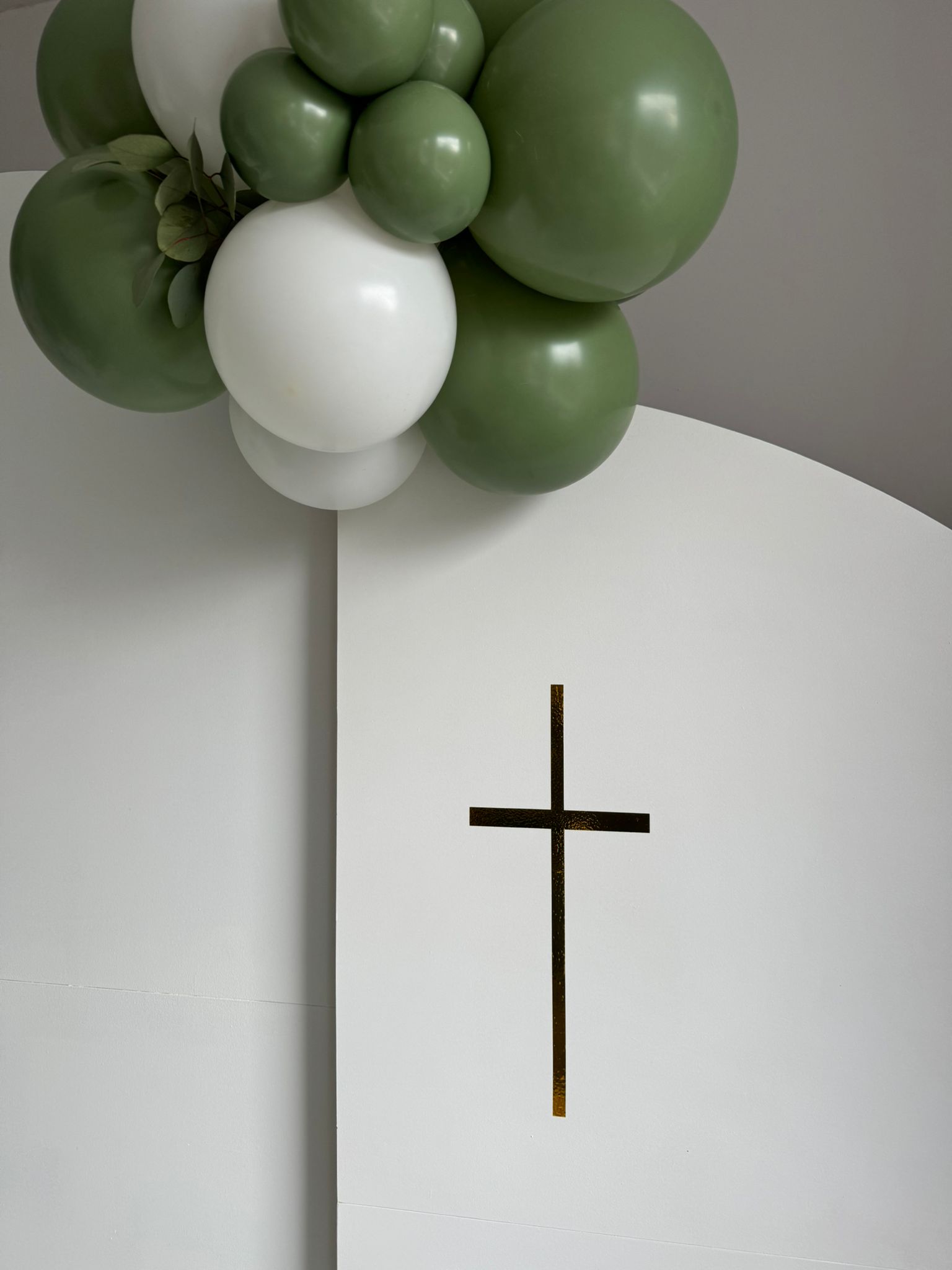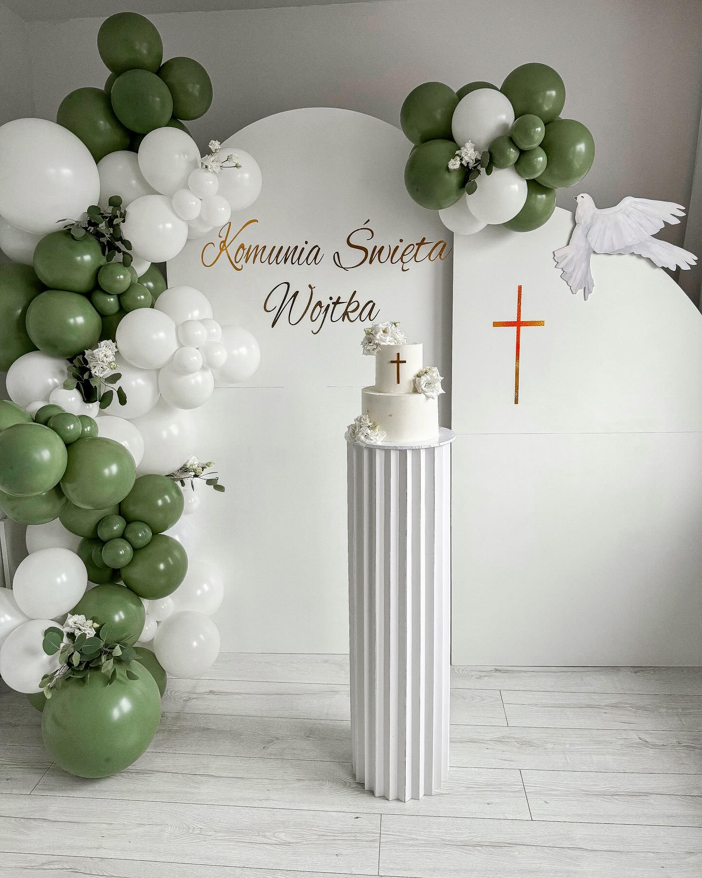 Dekoracja komunijna w Tarnowskich Górach – butelkowa zieleń, biel i złote detale. Spersonalizowana ścianka z imieniem, balonowa girlanda i tort na kolumnie tworzyły elegancką oprawę do zdjęć w prywatnym wnętrzu.