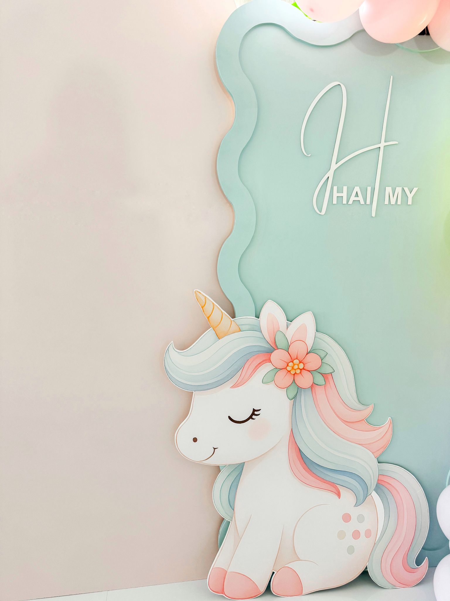 Delikatna kompozycja balonowa w pastelach z motywem jednorożca – lekka, subtelna, zaprojektowana pod roczek. Idealna na sesję zdjęciową i kadr rodzinny.
