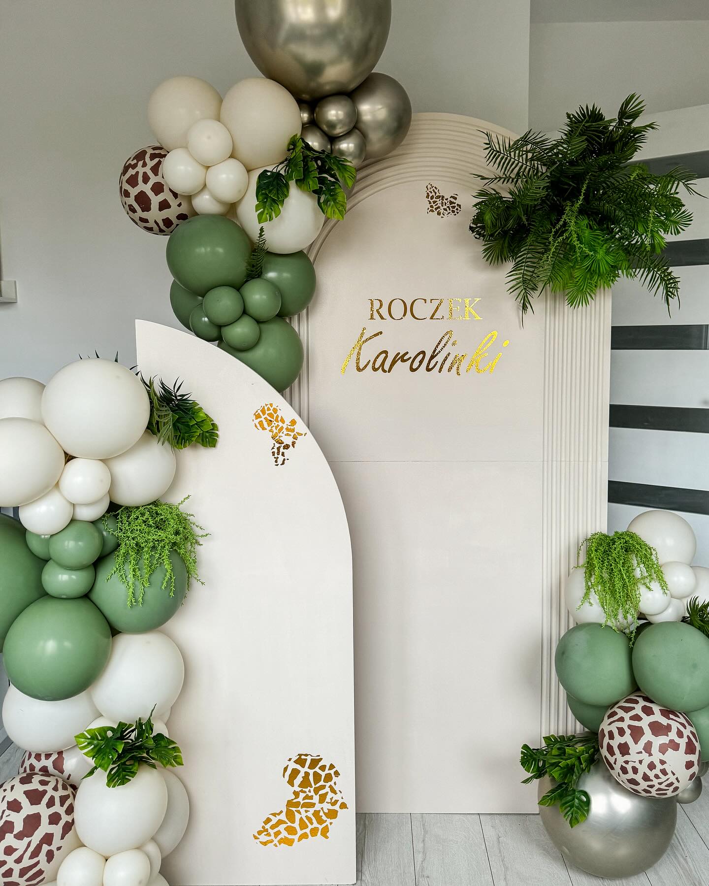 Dekoracja na roczek w stylu safari 🌿 – z balonami w naturalnych kolorach, liśćmi, printami zwierzęcymi i personalizowaną ścianką. Subtelna, ale wyrazista aranżacja na pierwsze urodziny Karolinki.
