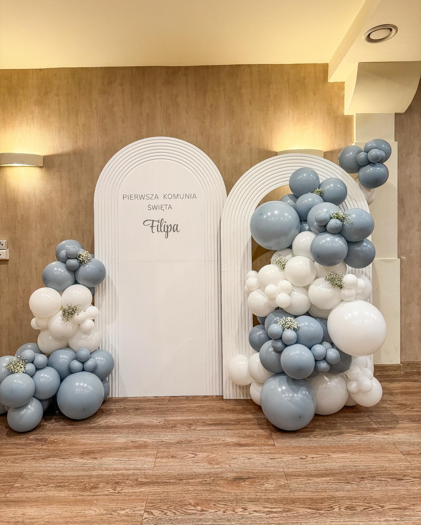 Dekoracja komunijna dla chłopca wykonana w Hotelu Diament Vacanza w Siemianowicach Śląskich. Ścianki modułowe z delikatnym frezem, girlanda balonowa w bieli i zgaszonym niebieskim oraz subtelne dodatki w postaci gipsówki stworzyły spójne tło do zdjęć.
