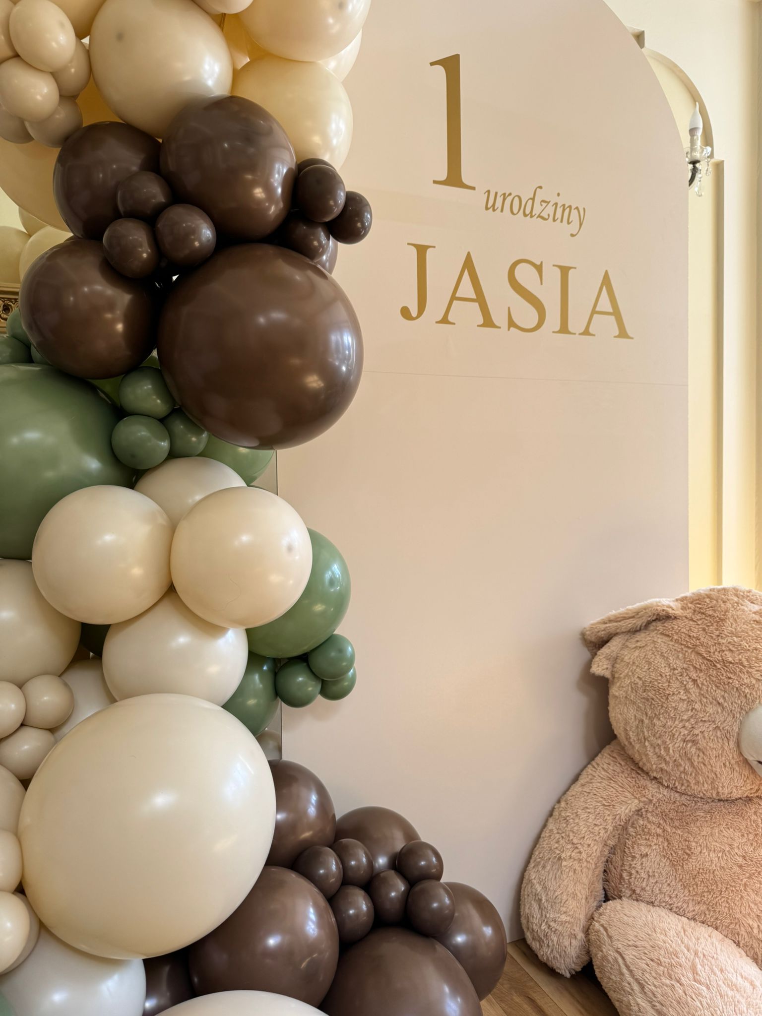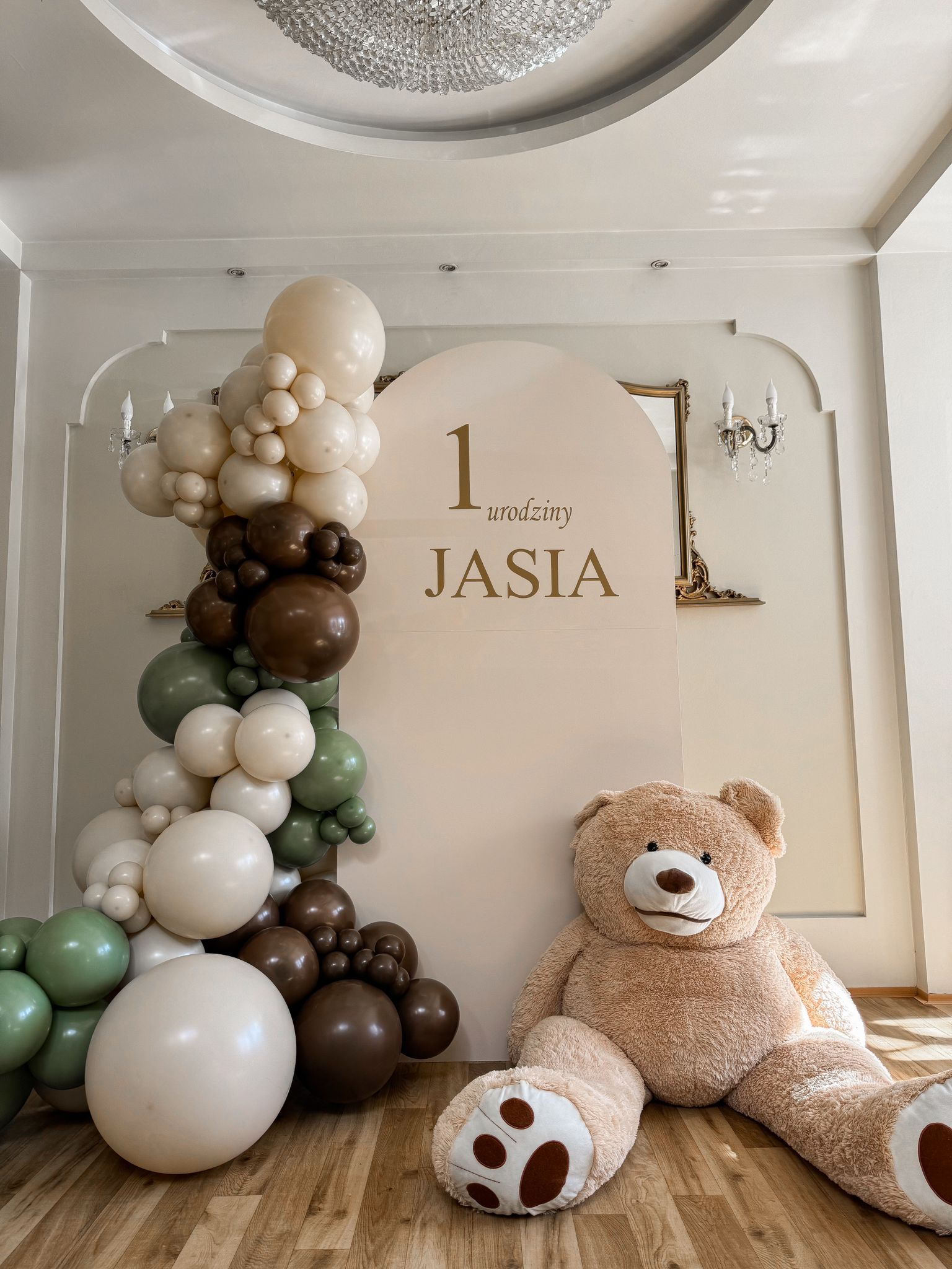 Dekoracja na 1. urodziny Jasia w restauracji Senator w Rudzie Śląskiej – beżowa ścianka z personalizowanym napisem i girlandą balonową w naturalnych odcieniach brązu, kremu i zieleni. Dodatkowo ogromny pluszowy miś jako uroczy akcent.