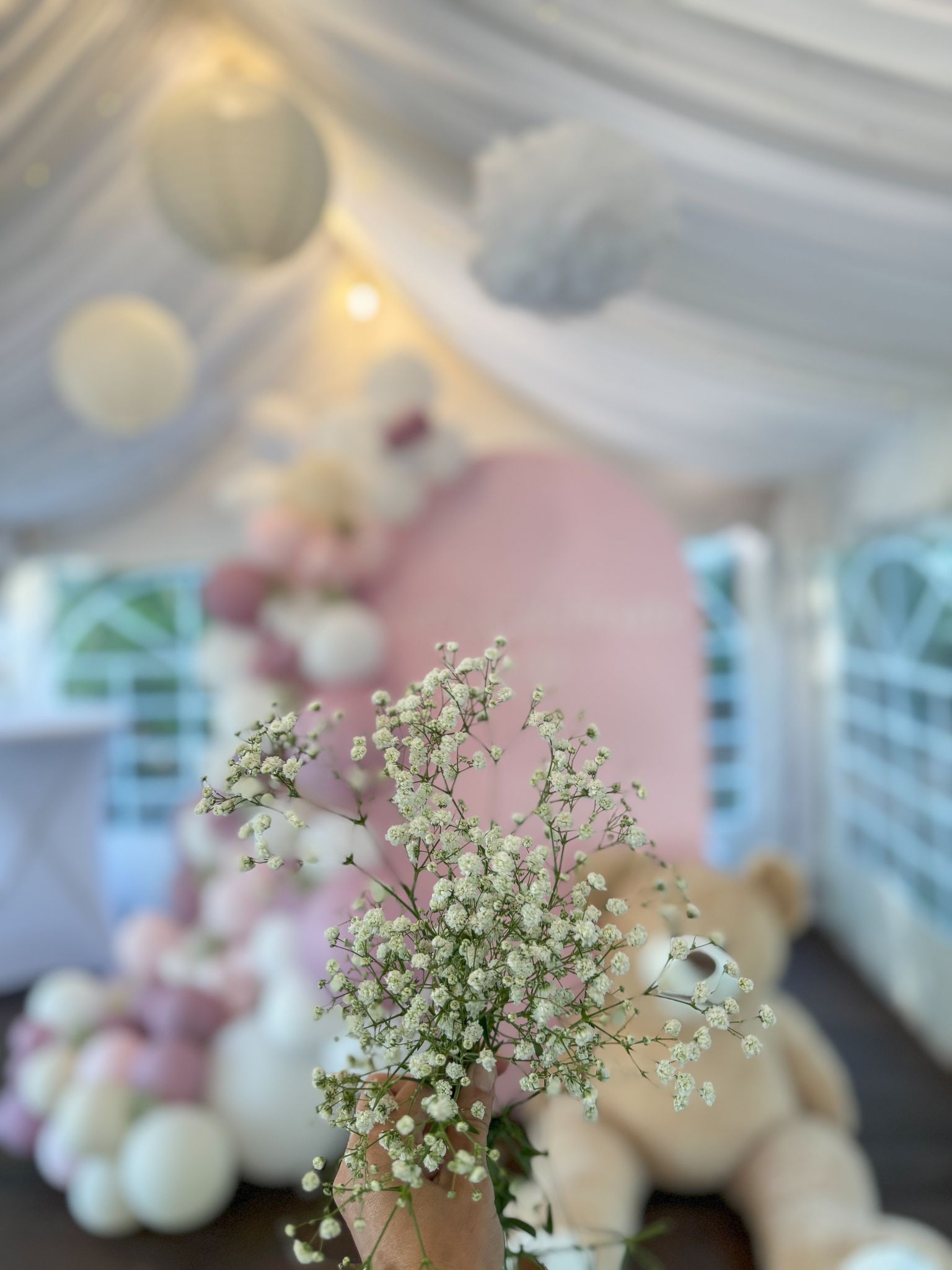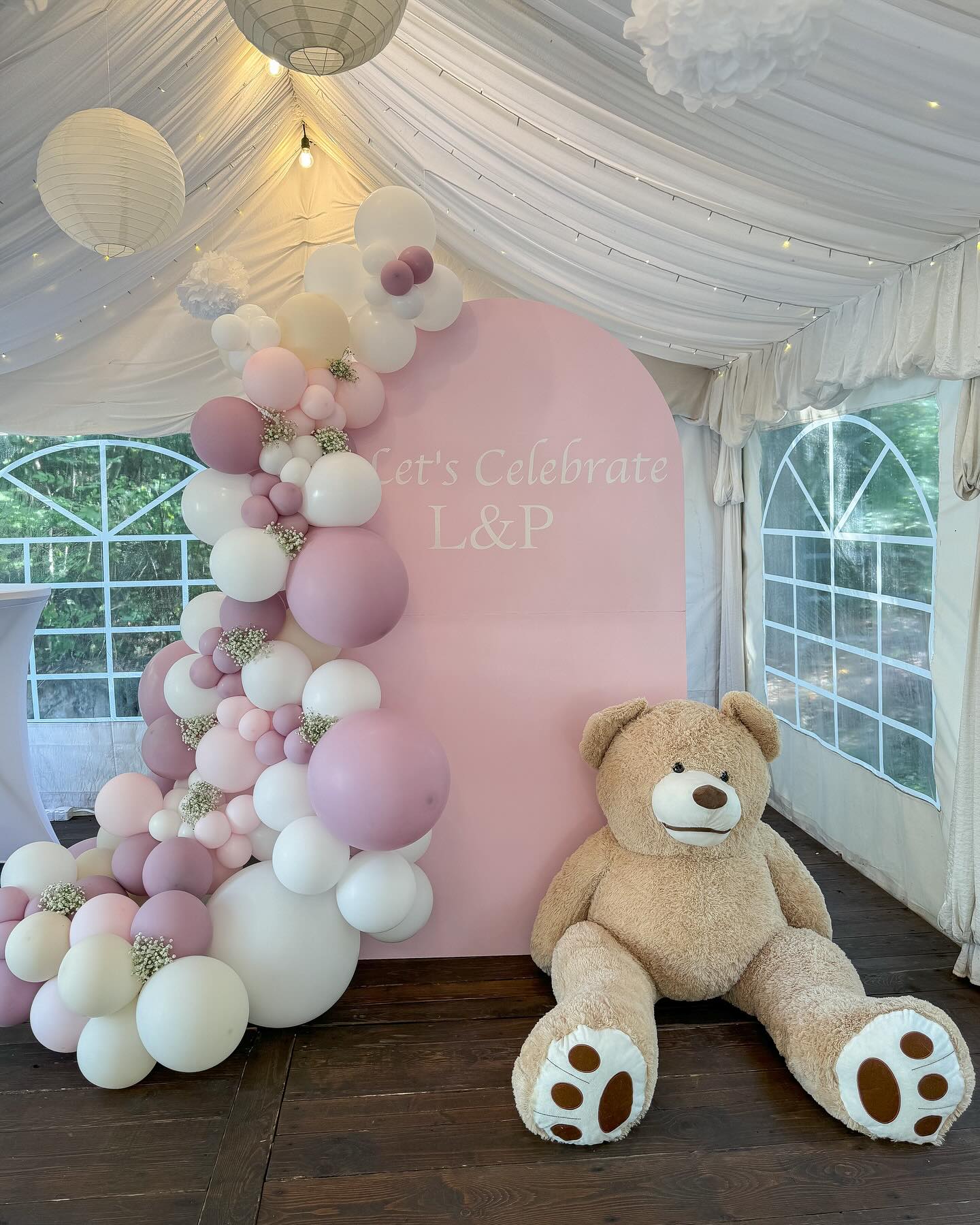 Dekoracja z okazji roczku – różowa ścianka z girlandą balonową, dodatkiem gipsówki i ogromnym pluszowym misiem. Przyjęcie odbyło się w namiocie ogrodowym przy Restauracji Senator w Rudzie Śląskiej.