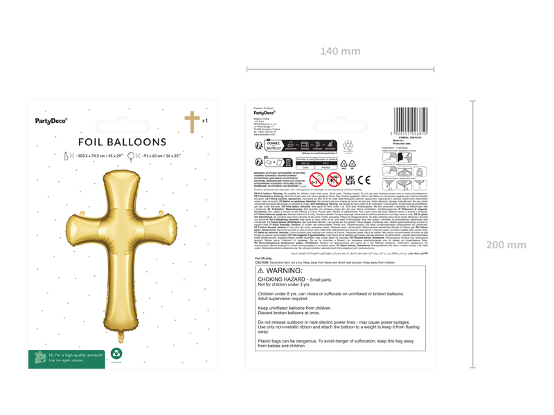 Balon foliowy Krzyż, 103.5×74.5 cm, złoty