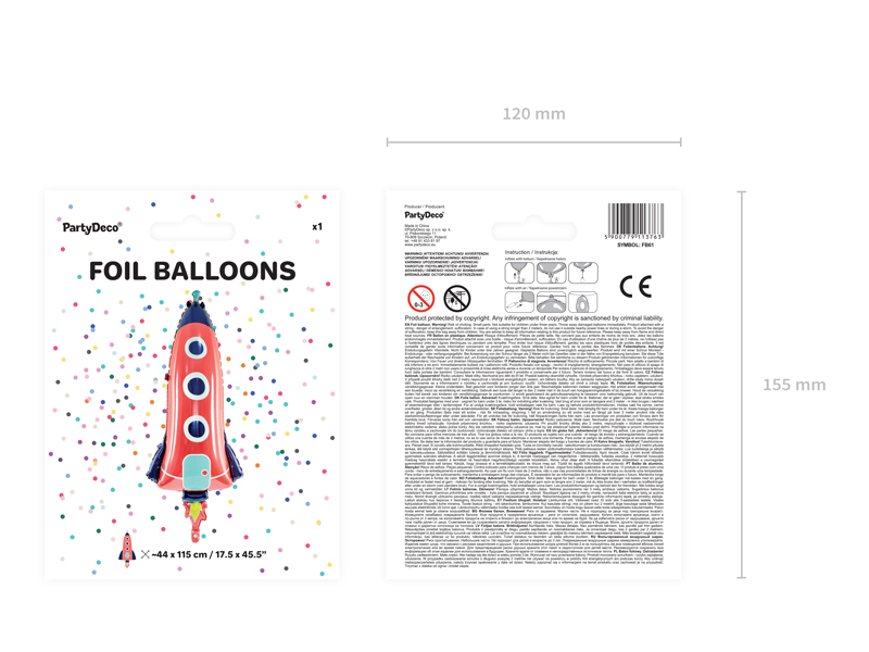 Błyszczący balon foliowy Rakieta, mix kolorów, wymiary ok. 44 x 115 cm (17.5 x 45.5”). Do napompowania powietrzem lub helem.