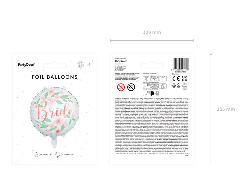 Balon foliowy Bride w kolorze białym z napisem Bride w kolorze różowego złota, wymiary przed napompowaniem ok. 45 cm (18”), wymiary po napompowaniu ok. 35 cm (14”). Do napompowania powietrzem i helem. Zestaw zawiera słomkę.