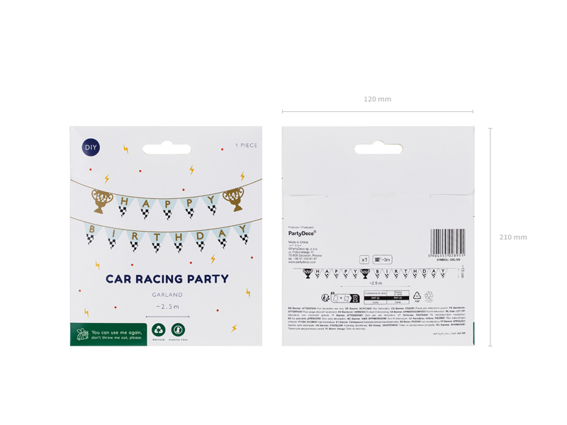 Nasz papierowy baner Happy Birthday z motywami kojarzącymi się wyścigiem samochodowym to oryginalny element aranżacji przyjęcia. Taka dekoracja doda mocy urodzinom dziecka i bardzo ułatwi przygotowanie przyjęcia z motywem przewodnim dla chłopca lub dziewczynki. Tematyczny baner na urodziny to jedna z najpopularniejszych wśród klientów dekoracji wiszących – w prosty sposób pozwala zaaranżować mieszkanie lub wynajętą salę na przyjęcie.