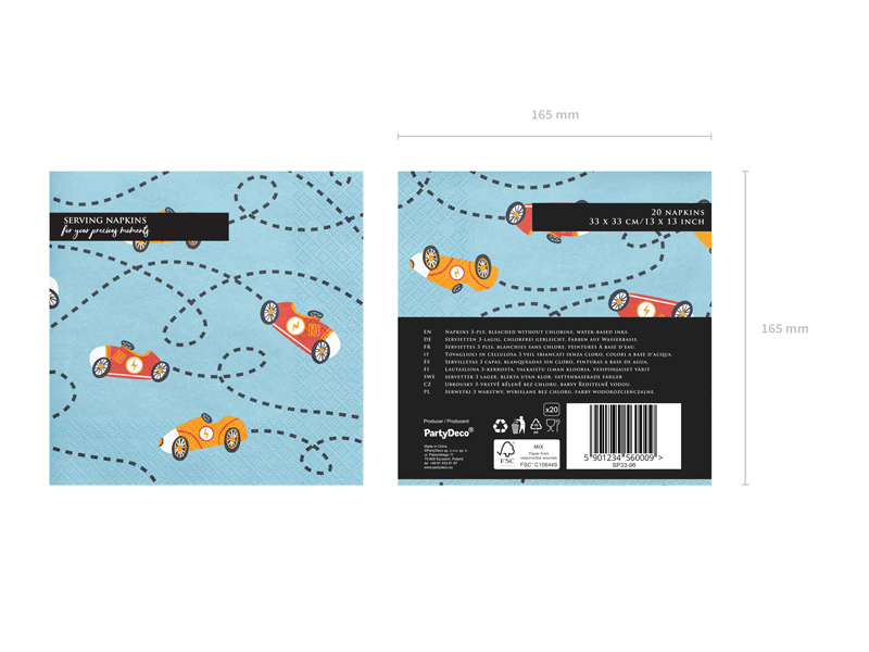 Nasze papierowe serwetki z motywem samochodów wyścigowych to oryginalny element aranżacji przyjęcia. W połączeniu z tematycznymi kubeczkami, papierowymi talerzykami i topperkami dadzą efekt, który oczaruje każdego chłopca. A to przecież najważniejsze. Z tak udekorowanego stołu wszystkie przysmaki znikną w oszałamiającym tempie.