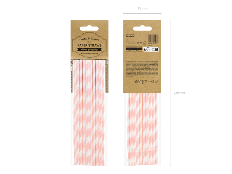 Słomki papierowe w kolorze jasnoróżowym z białymi ukośnymi paskami, długość około 19,5 centymetra.