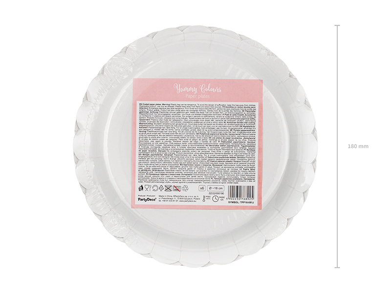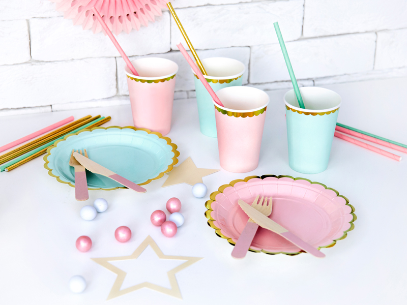 Talerzyki papierowe w kolorze jasnoróżowym ze złotymi metalizowanymi brzegami, średnica ok. 18 cm.